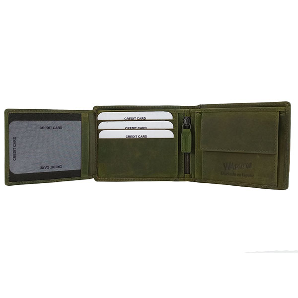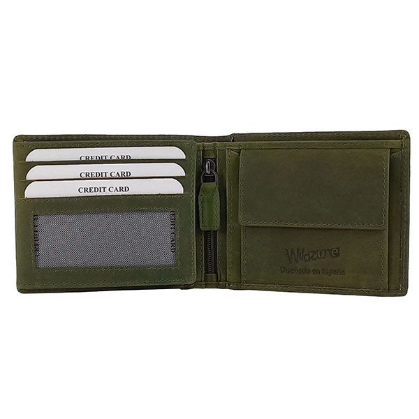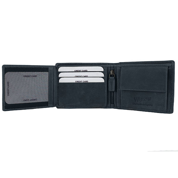 • Compartimentos: 2 billetes, 6 tarjetas, 1 bolsillo con cremallera para monedas