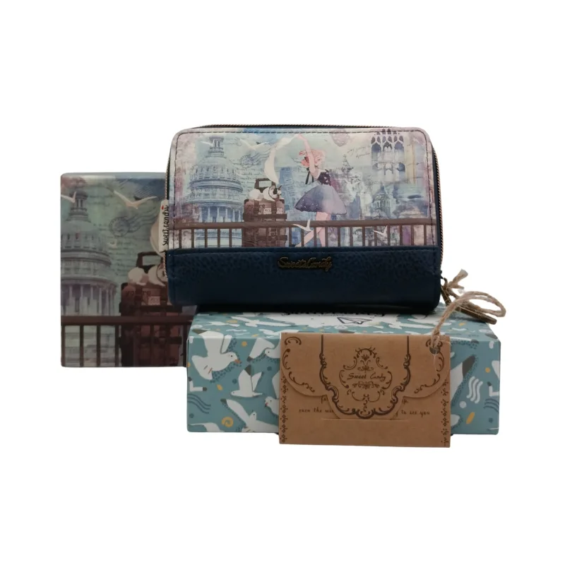 Cartera sintética con diseño de muñeca Sweet Candy tarjetero extraíble y caja incluída.