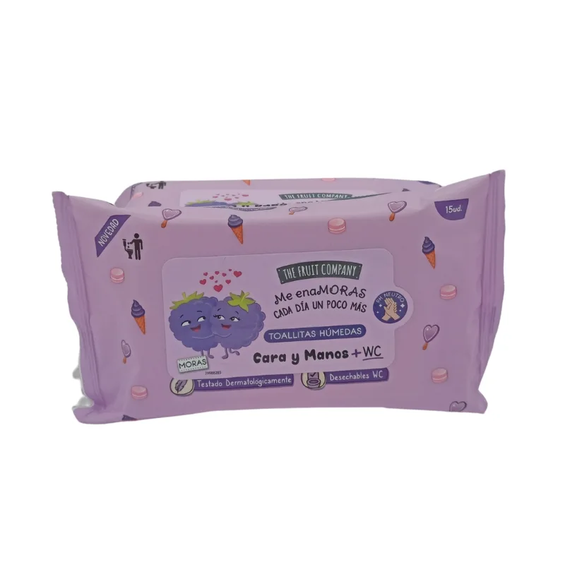 Toallitas húmedas de moras de The Fruit Company vienen en un paquete de 15 unidades. Estas toallitas están diseñadas para ofrecer una limpieza eficaz y dejar un aroma dulce y refrescante a moras. Son adecuadas para limpiar manos, cara y superficies, y están formuladas con Aloe Vera, Vitamina E y Camomila, lo que las hace suaves y calmantes para la piel2.