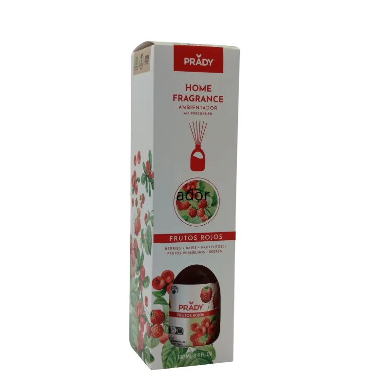 El Mikado Frutos Rojos 100ml de Prady es un ambientador decorativo con un aroma dulce y afrutado. Está elaborado en España con alcohol y esencias naturales, ideal para aromatizar espacios pequeños como el hogar u oficina. Se presenta en un frasco de cristal con varitas difusoras, que absorben el perfume y lo dispersan en el ambiente.